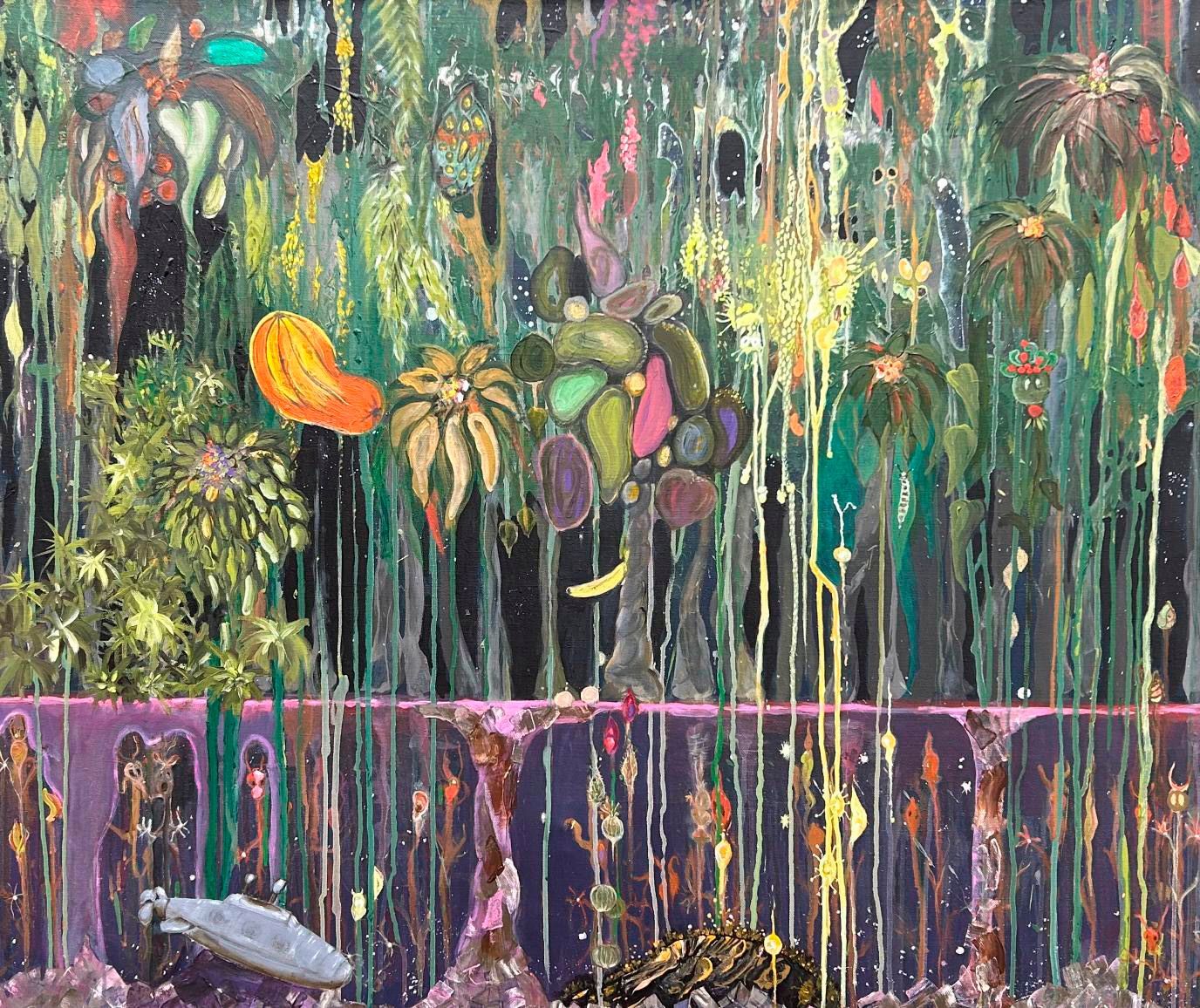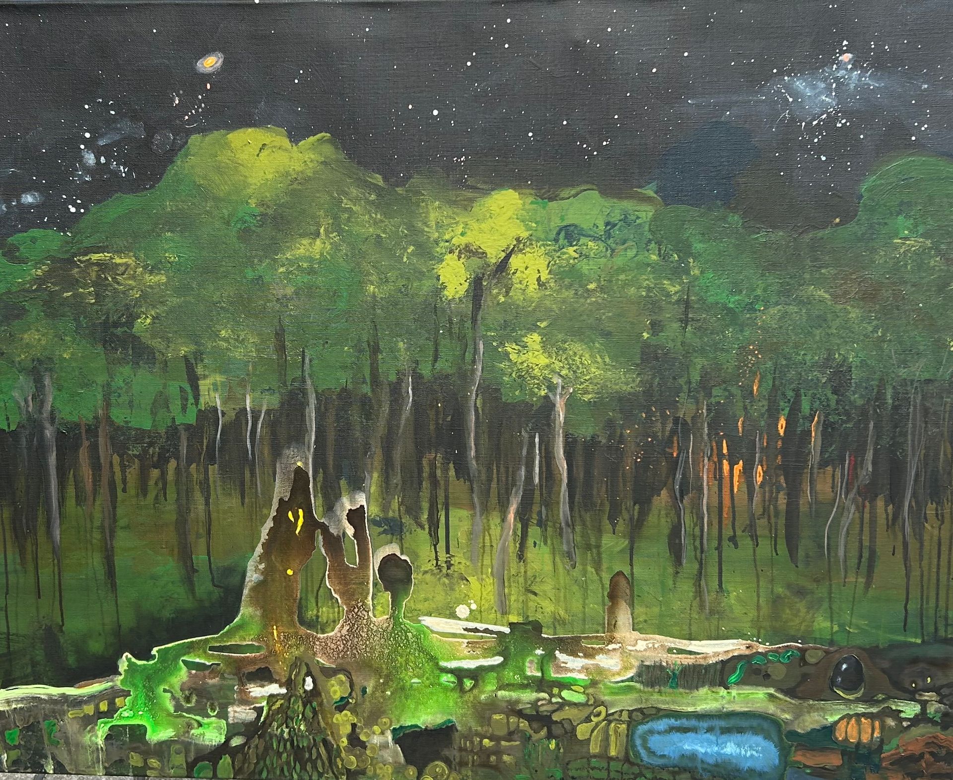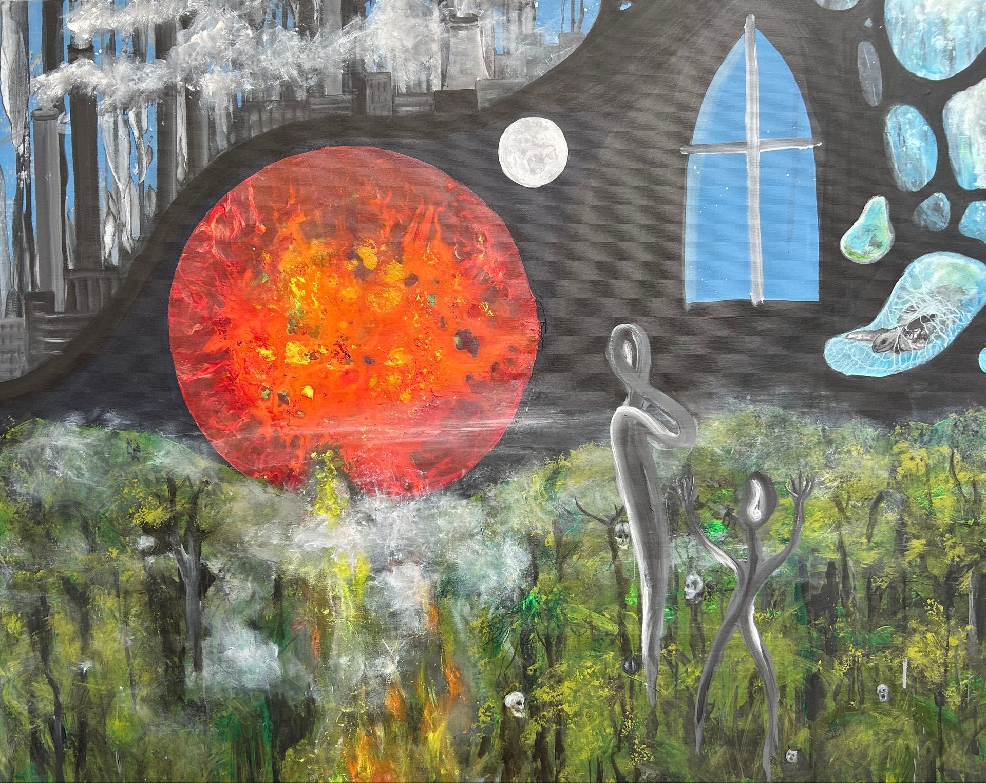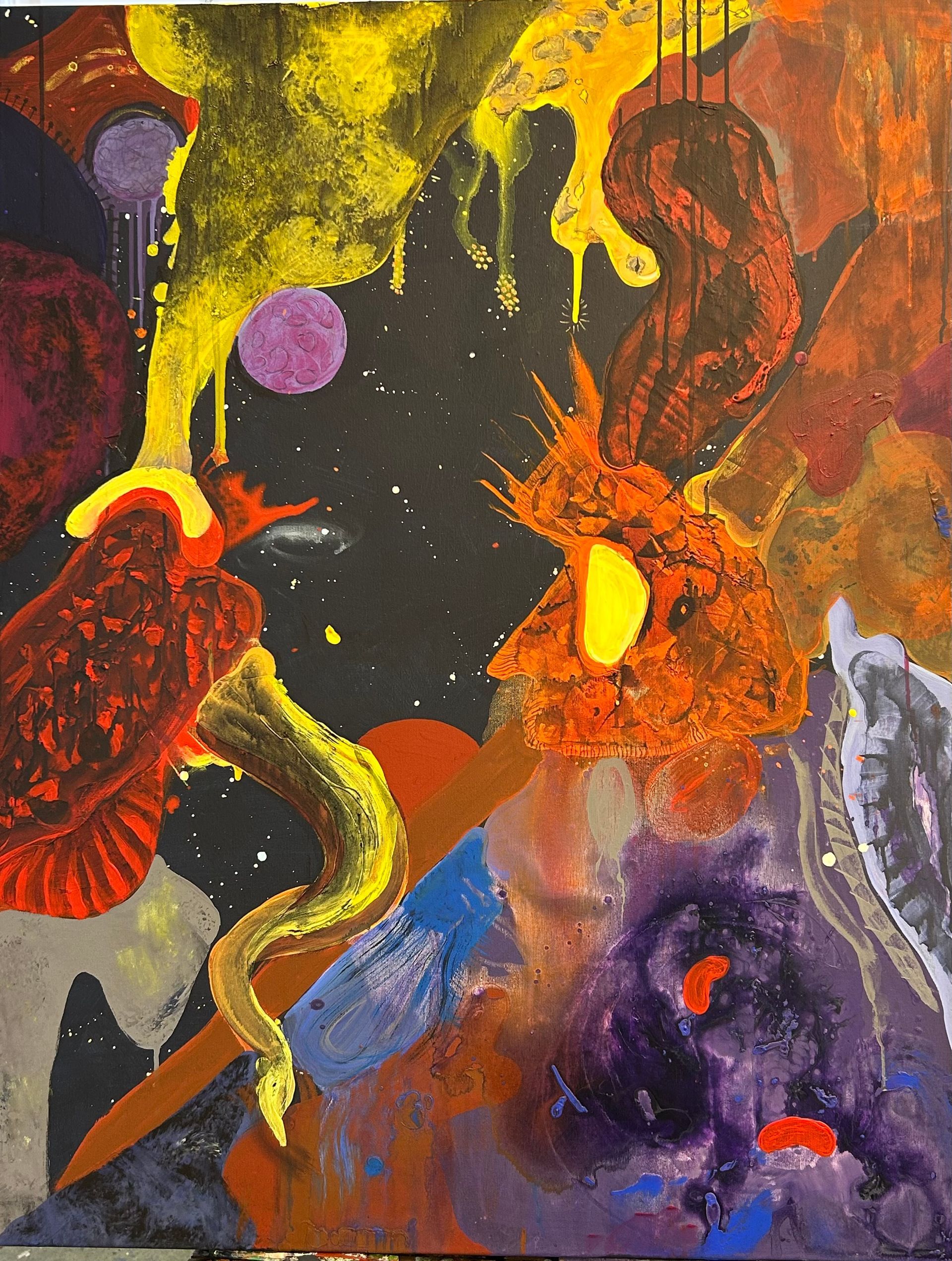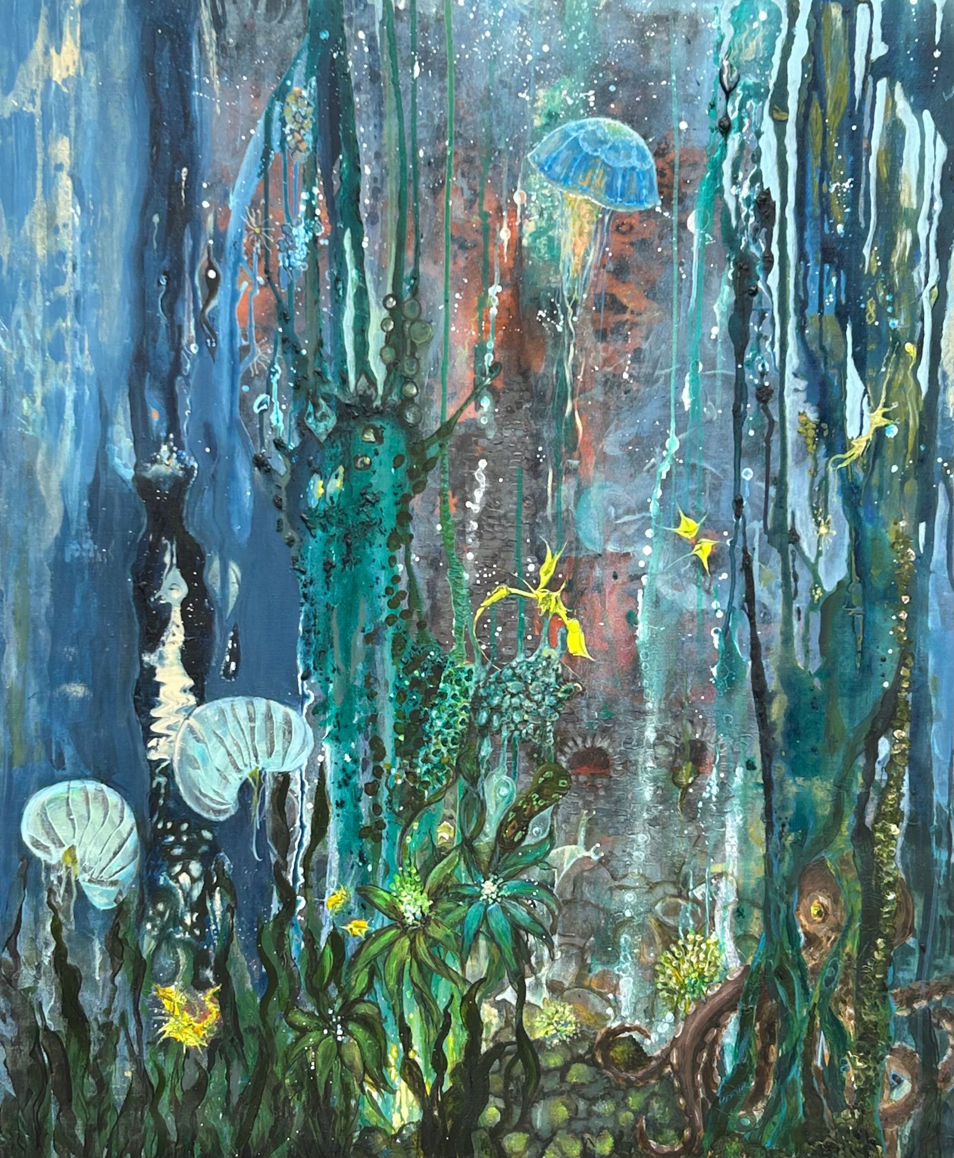 Ich male bevorzugt frei und intuitiv, um mich auszudrücken. Sehr gern kombiniere ich eine abstrakte Vorgehensweise in kraftvoll fließenden Prozessen mit realistischen, oft figurativen, Elementen. Diese spannenden oder geheimnisvollen Kompositionen reizen mich besonders und muten surrealistisch an.